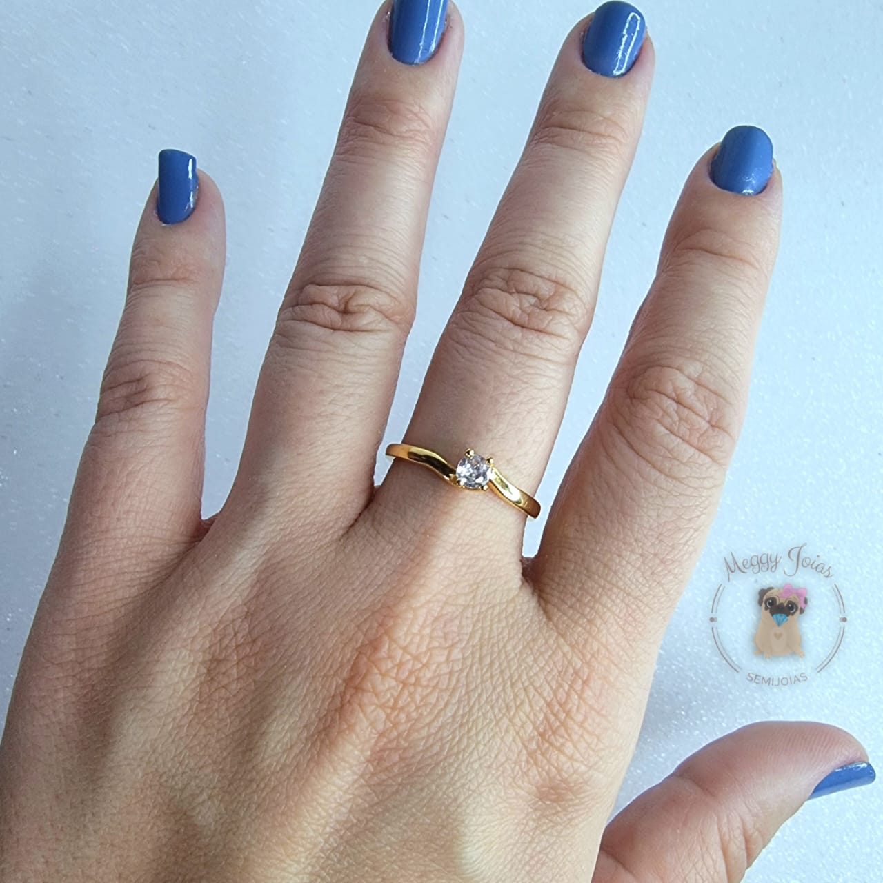 - Anél folheado a ouro modelo solitário trabalhado com pedrinha de zirconia;