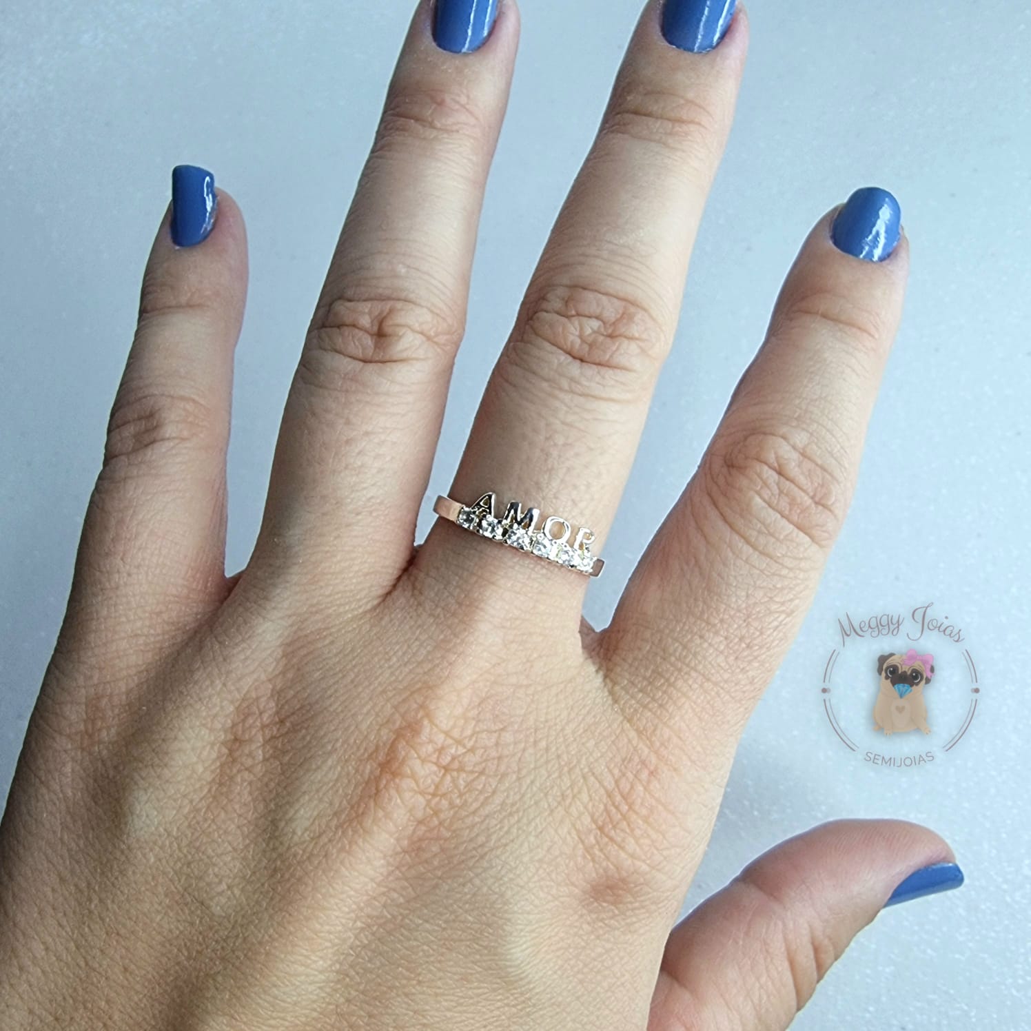 - Anél prata trabalhado escrito AMOR com pedrinhas de zirconia embutidas;
