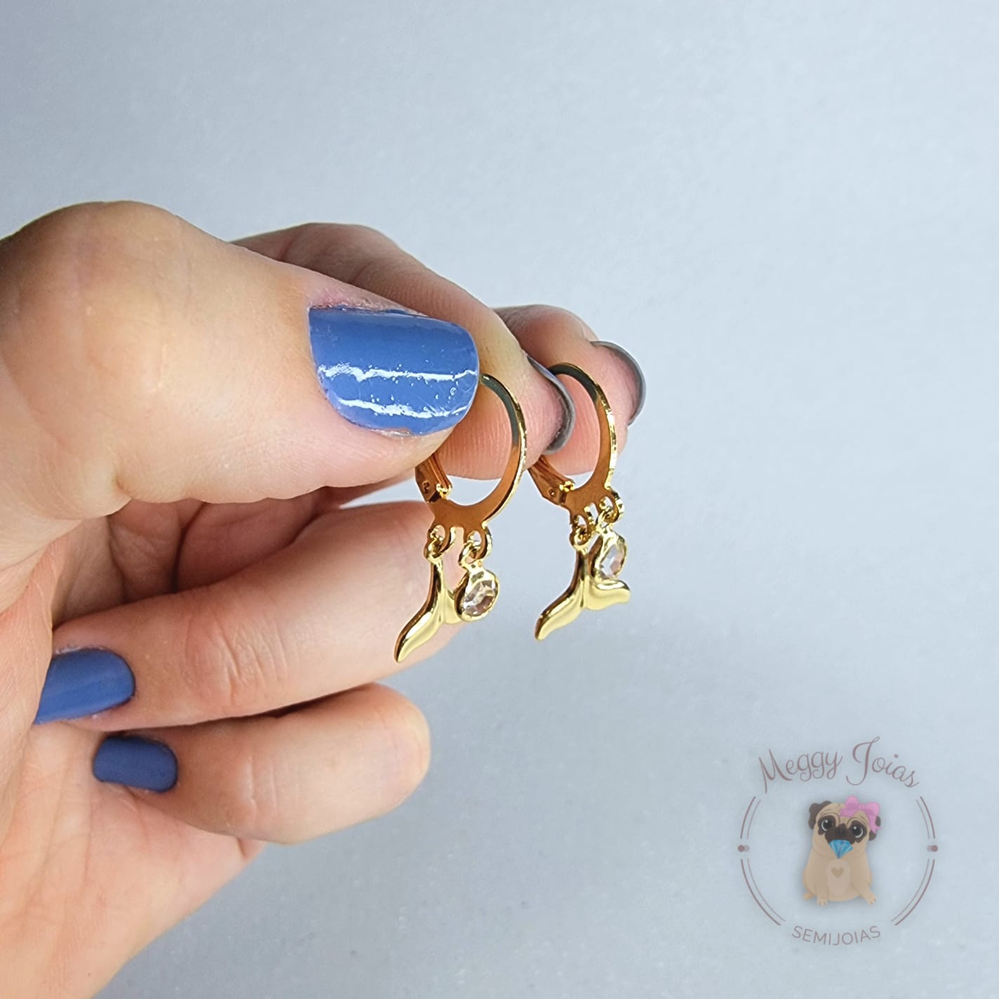 - Brinco folheado a ouro modelo argolinha com rabo/calda sereia e pedrinha;
