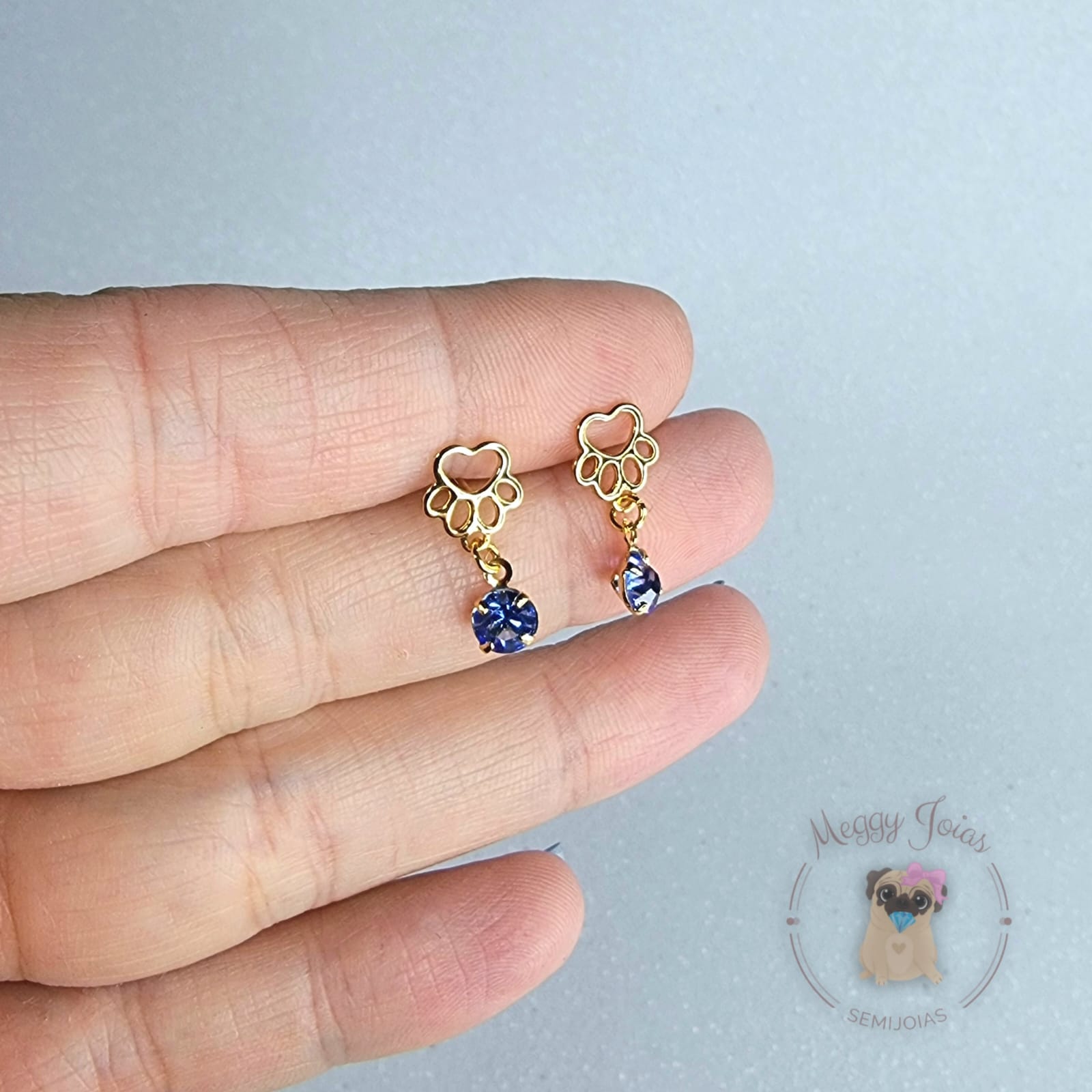 - Brinco folheado a ouro trabalhado patinha vazada com pedrinha azul;