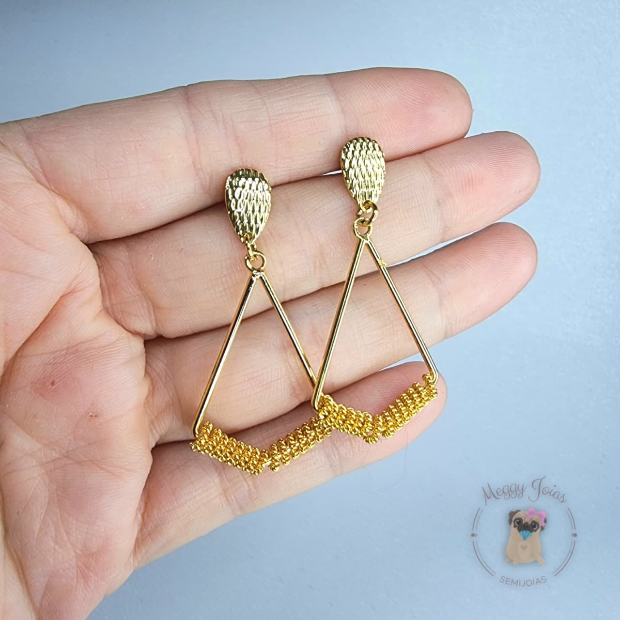 - Brinco folheado a ouro triangular com detalhes foscos em espiral;
