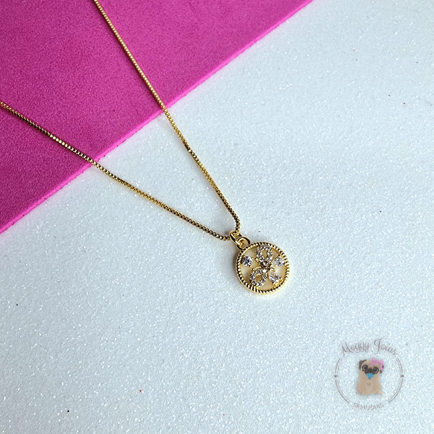 - Pingente em formato de medalhinha com borboleta cravejada com pedrinhas de zirconia;