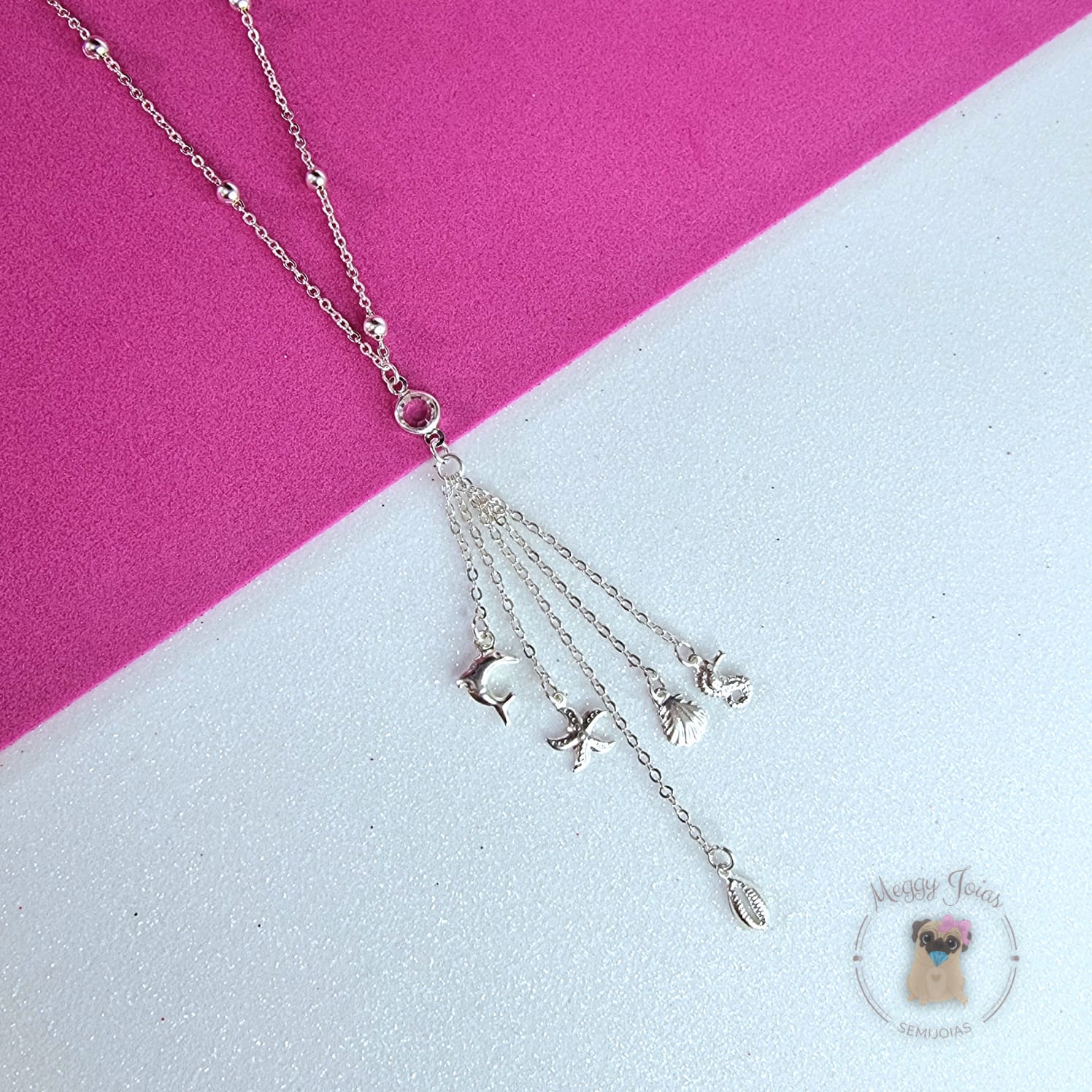 - Pingentes de mar: golfinho, búzio, cavalo marinho, concha, estrela do mar e pedra transparente;