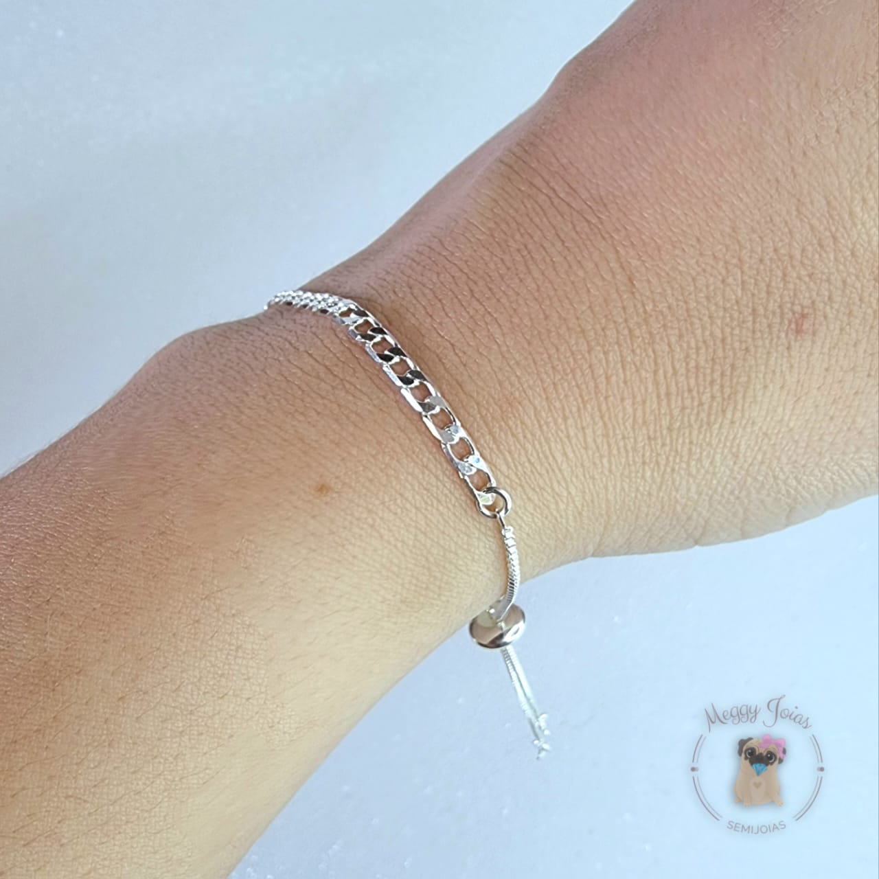 - Pulseira prata modelo gravata trabalhada metade grumet e metade veneziana;