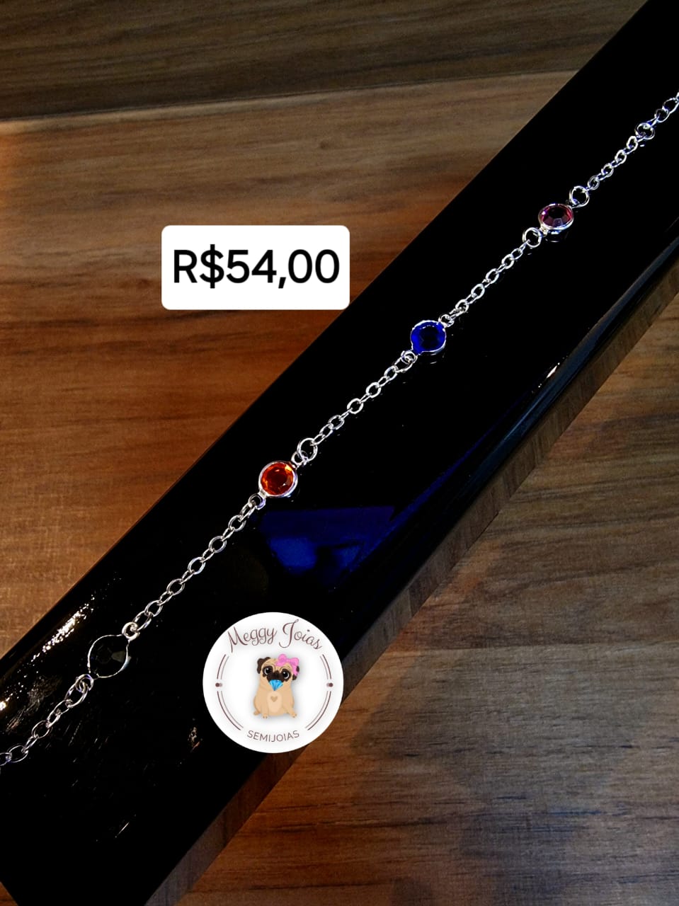 - Pulseira prata trabalhada com pingentes de pedras coloridas embutidos;