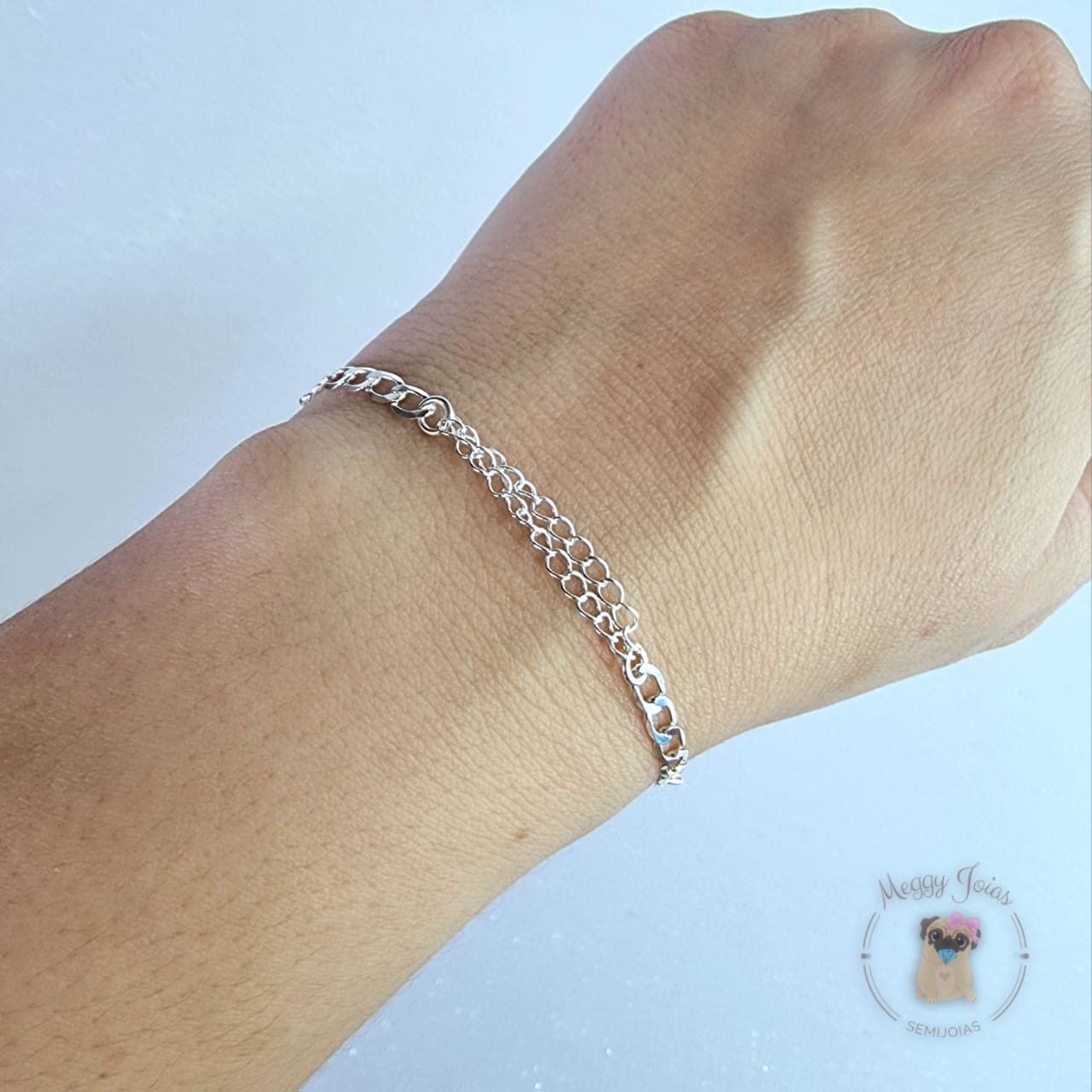 - Pulseira prata trabalhada com detalhes duplos e elos abertos;