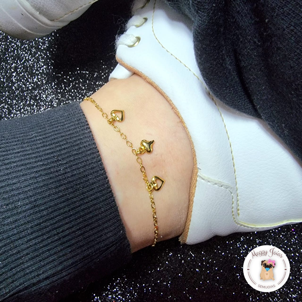 - Tornozeleira folheada a ouro trabalhada com pingentes embutidos;